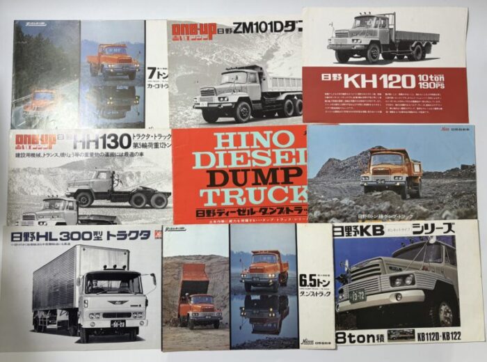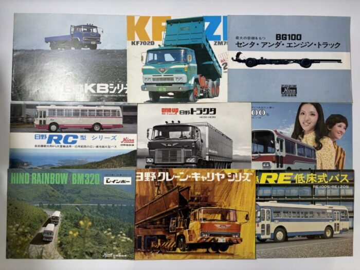 早速、宅配で送られてきた自動車カタログは100点ほど。上の画像はその中でも高評価できる旧車をピックアップしました。一般車のカタログはよく流通しますが、今回は珍しくトラックやバスといった入手難易度が比較的難しい希少なカタログが大半を占めています。