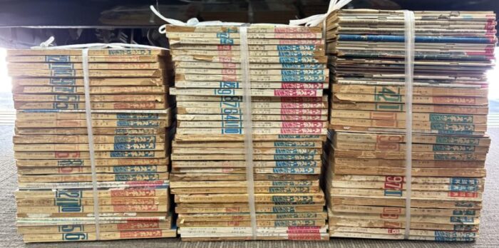 一軒家の2階にあった雑誌を紐で縛ると全体で3束、100冊以上になりました。1960年代の野球雑誌(週刊ベースボール)なので、背が剥がれていたり、目立つ汚れ等、画像からでも見うけられますが値段つけて買取しました。