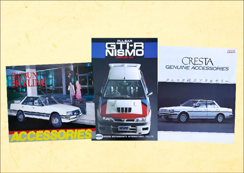 アクセサリーカタログは車に追加できる装備やドレスアップパーツ をまとめたカタログになります。特に旧車のアクセサリーカタログは発行部数が少なく、当時のカスタム文化や情報が掲載されていることから資料として注目されています。人気車種は車両本体のカタログよりも中古市場価格が高い場合があります。