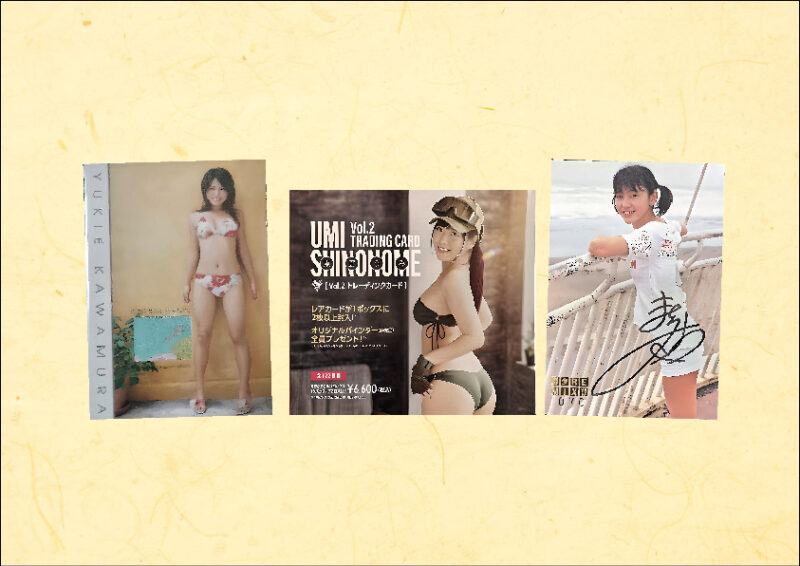 当店はアイドルやタレントのトレーディングカードも得意ジャンルです。直筆サイン入り、水着などのコスチュームが付属しているトレカ、抽選品、初回限定版トレカなどをよく取り扱いしています。雑誌に付いていたものも実は値段がついたりするので気になるものがあればお気軽にお尋ねください。